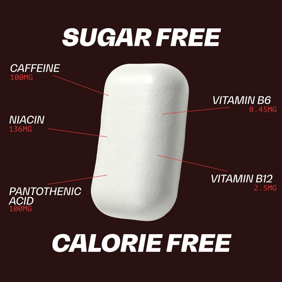 Isomalt, Gum Base, Caffeine, Natural Flavourings, Sweeteners (Acesulfame K, Sucralose), Gum Arabic, Glazing Agents (Carnauba Wax, Beeswax), Colours (Paprika Extract, Titanium Dioxide).
